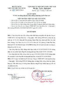 Viện Vật liệu xây dựng quyết định đình chỉ hiệu lực chứng nhận đã cấp cho Công ty TNHH Một thành viên liên hợp khoa học – Công nghệ – Môi trường BIWASE